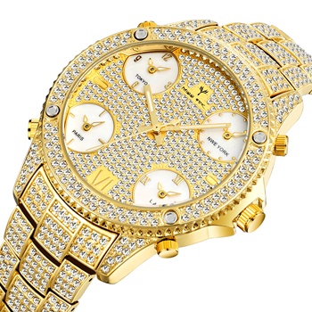 Часы наручные мужские кварцевые, роскошные брендовые водонепроницаемые Модные в стиле хип-хоп, из нержавеющей стали, с большим циферблатом и украшением из стразов, 18 К золота